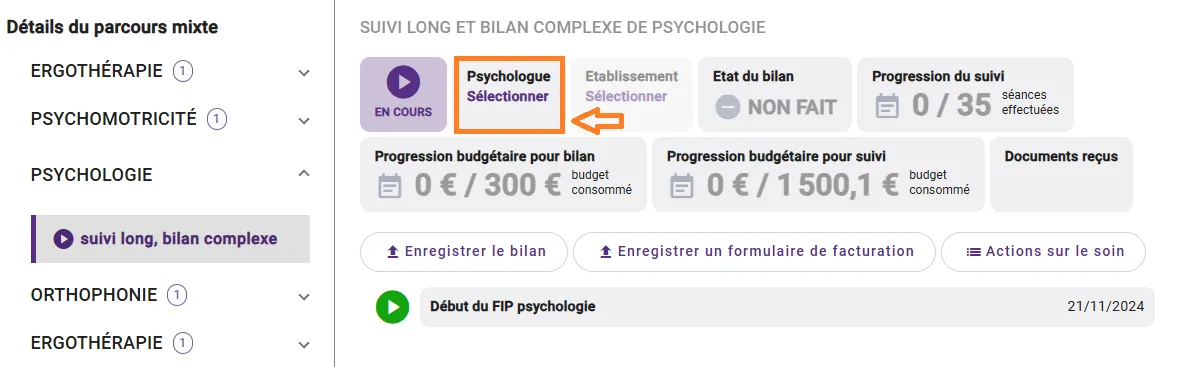 NB : Pour pouvoir sélectionner un praticien à un parcours FIP, il sera nécessaire d’avoir ajouté au préalable ce praticien avec toutes ses informations dans votre onglet “Professionnels”.