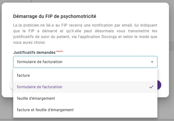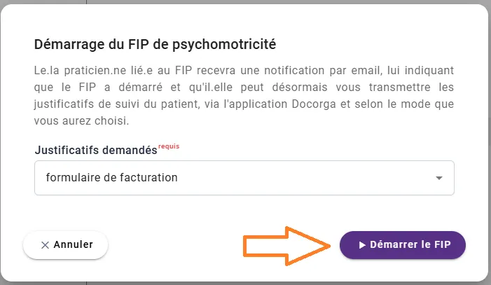 Vous pourrez ensuite sélectionner les justificatifs demandés dans le cadre du démarrage de parcours FIP.