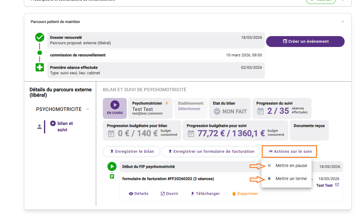 Vous avez notamment la possibilité de mettre un soin en pause ou d'y mettre un terme.