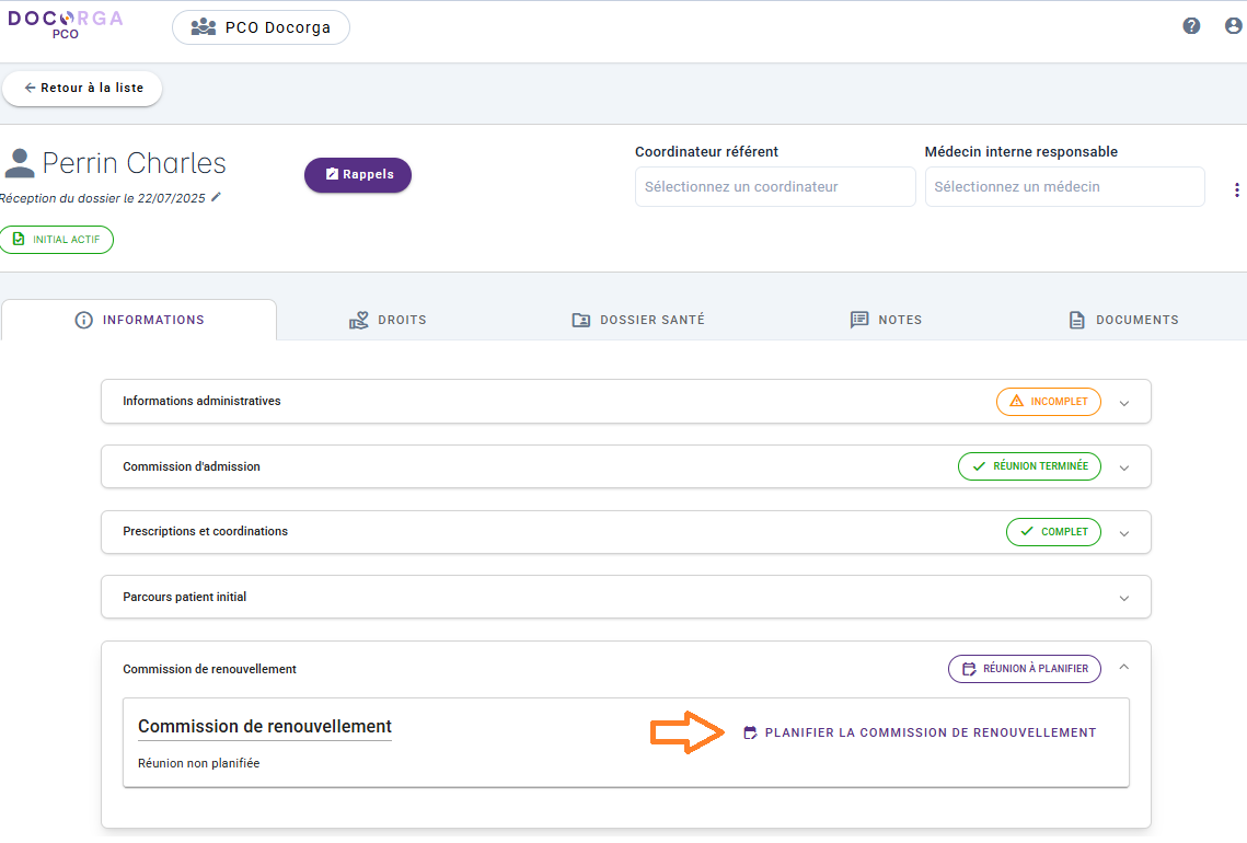 Depuis le dossier du patient, cliquez sur “Commission de renouvellement” puis sur “Planifier la commission de renouvellement”.