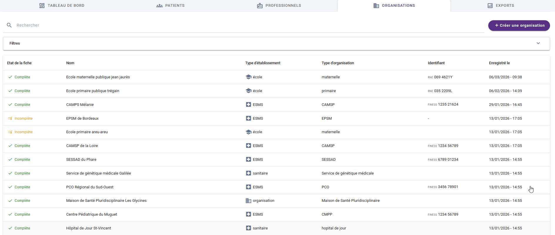 Depuis l’onglet Organisations, vous pouvez enregistrer les structures partenaires ou intervenantes dans le parcours de soin des patients (établissements, associations, écoles, etc.).
